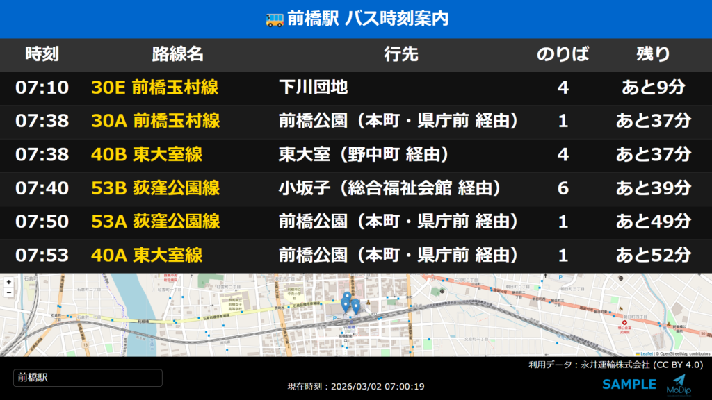 https://www.modip.jp/gtfs_signage_sample.html?title=🚌前橋駅 バス時刻案内&time=0700&stop_id=001007_01&lisence= CC BY 4.0